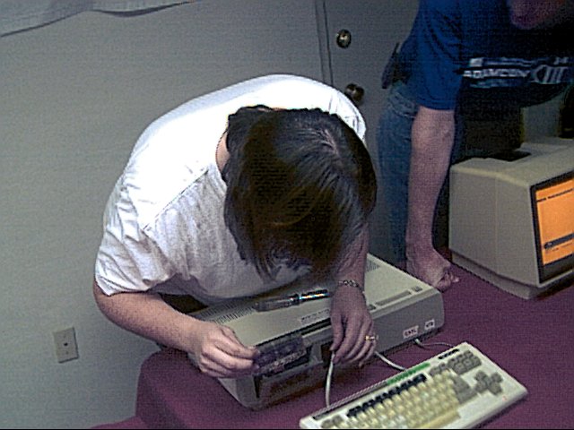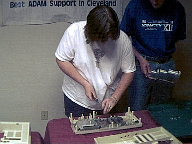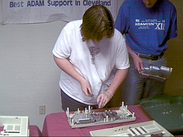 Sunday represented a new challenge to Adam owners. Rich D setup two Adams and booted them by tape to the SmartBASIC ']' prompt. Then he gave each of two teams a Philips and a slot screwdriver. The challenge was to completely dissassemble and then reassemble the console, and boot to SmartBASIC. The teams consisted of one Slopsema husband as the team "expert" and one Slopsema wife as the chief tech. The teams were Doug and Meeka on one side and Bob and Judy on the other side.